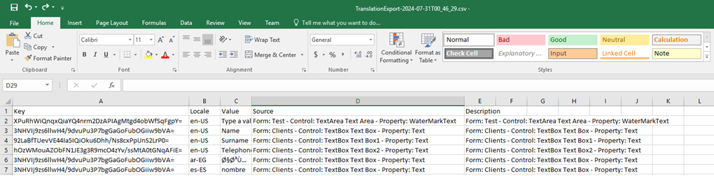 - New imported keys must always have a default value. For example, when you export translations that were created for English as the default language, you must copy that key and provide your preferred Locale and Value for the new language you want to import.