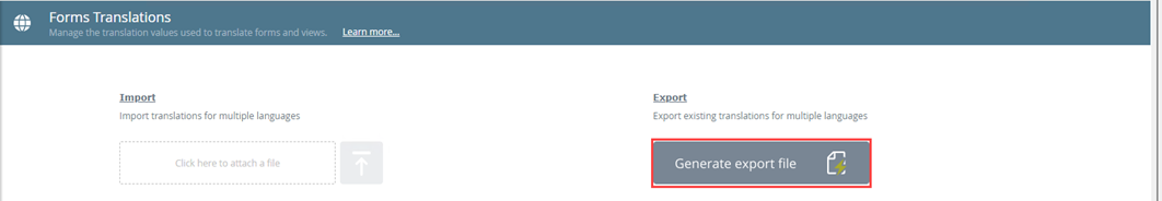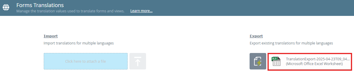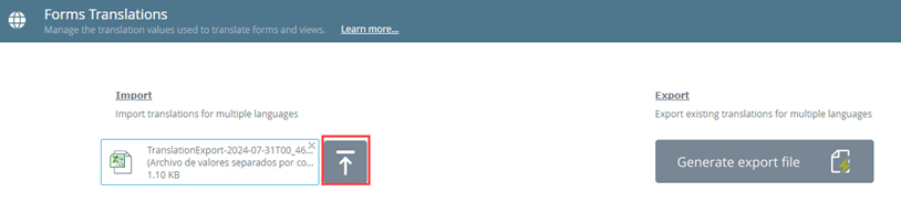 Use the Export feature to export existing translations into a XLSX (Microsoft Excel Spreadsheet) file. Note that all existing translations are exported. Use the file to add custom translation values for multiple keys and languages. Once edited, you must import the file to apply the changes.
