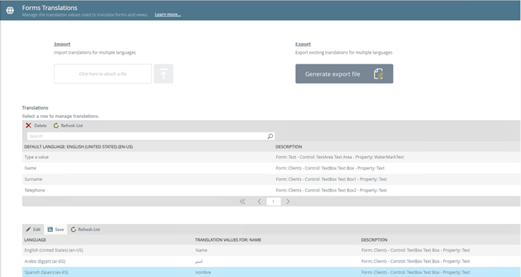 Runtime translation allows your views and forms to be translated at runtime. You can add or remove languages, and set a default translation language for views and forms. You can manually update auto-generated translation values, or use the export/import functionality to do this.