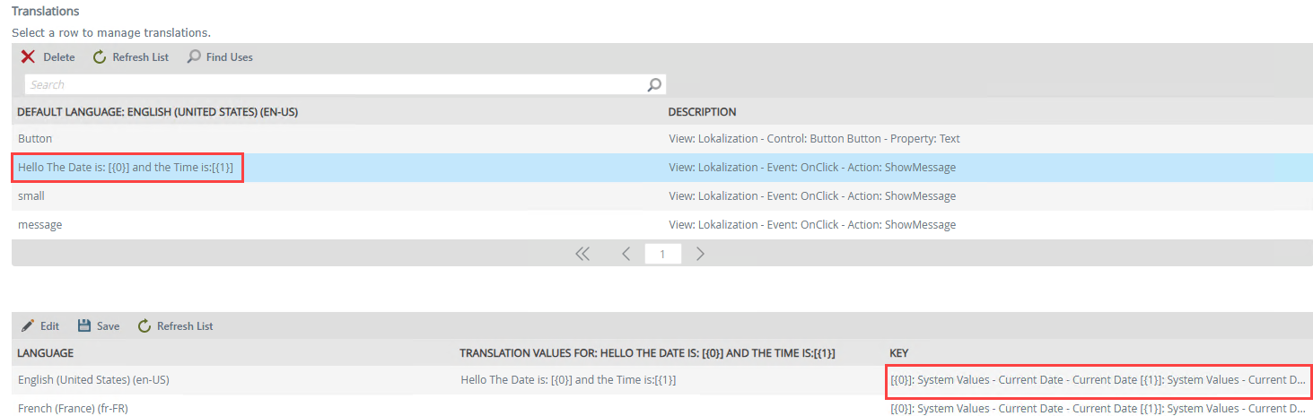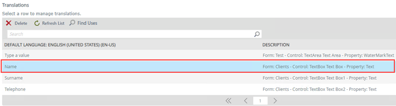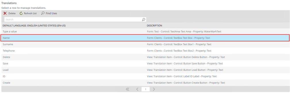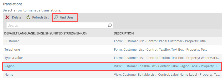 The Find Uses button allows you to view a list of instances for which a translation has been used within a view or form.