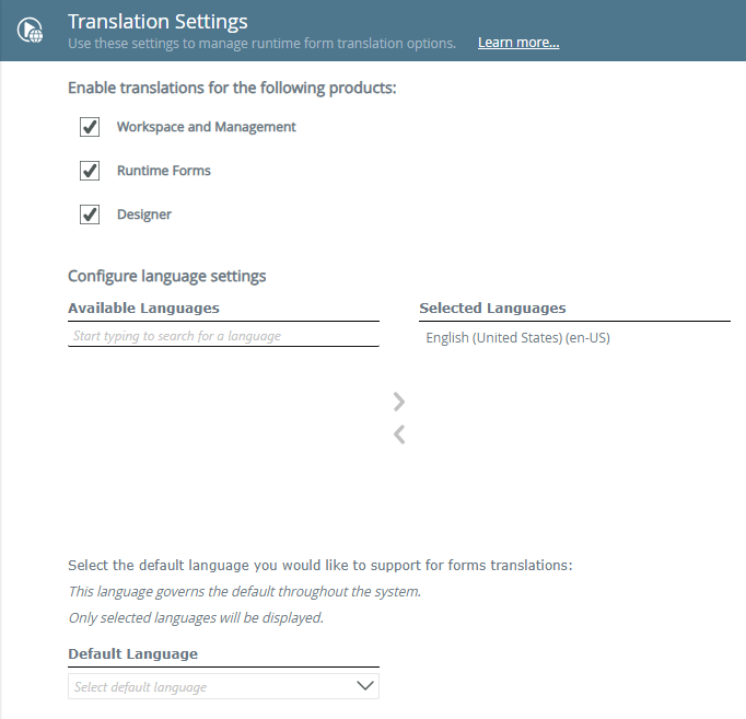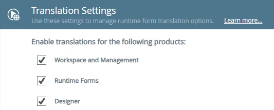 Translations can be enabled or disabled per product to allow people to view it in all supported languages. Translations for Workspace, Management, and the Designer is applicable to design time translation, and translations for Runtime Forms is applicable at runtime.