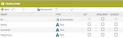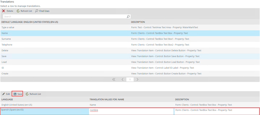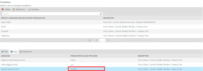 | Value | Translation value for the Key, for example when you provide a value for the Name key in Spanish, the value is nombre. | Type in the new translation value for the Key. |