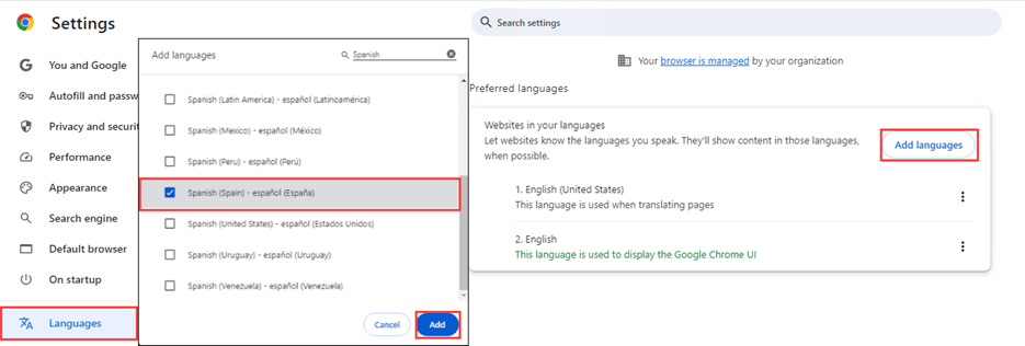 Go to your browser’s Preferred languages setting and add Spanish (Spain).