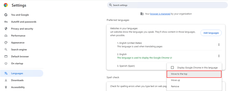 Click the option for Spanish and select "Move to the top". This will now change your default language to Spanish for web pages.