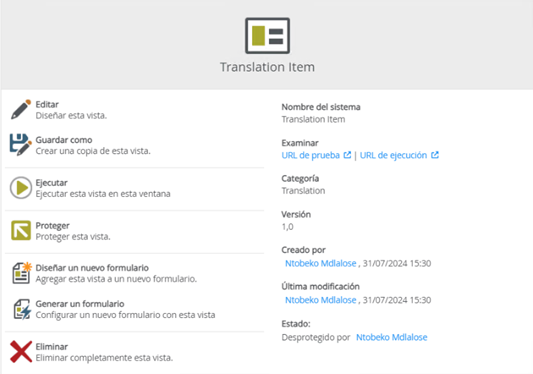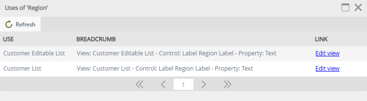 Property Description Use The view or form name. Breadcrumb This is where the translation is found within the view or form in the order of view/form name – control name – property name. Link A link to the view or form where the translation is used. Clicking the link opens the view or form in the Designer.