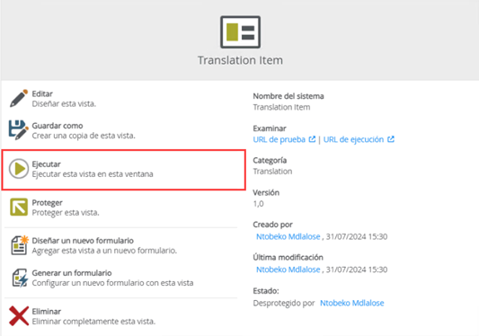 Select the view you created in the beginning and select Ejecutar (Run).