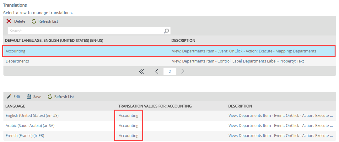 - Click Edit and type the value next to the language. Click Save to save the new translation value.