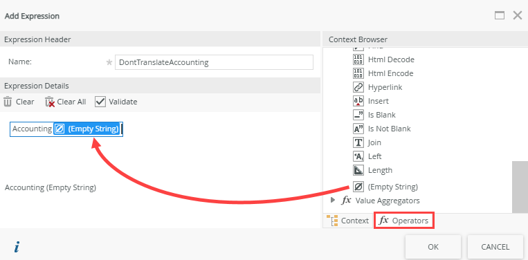Solution 2: Create an expression for the value and use a Text>Empty String operator in the same text box to avoid translations as shown below, then use the expression in the SmartObject input property instead of the static value.