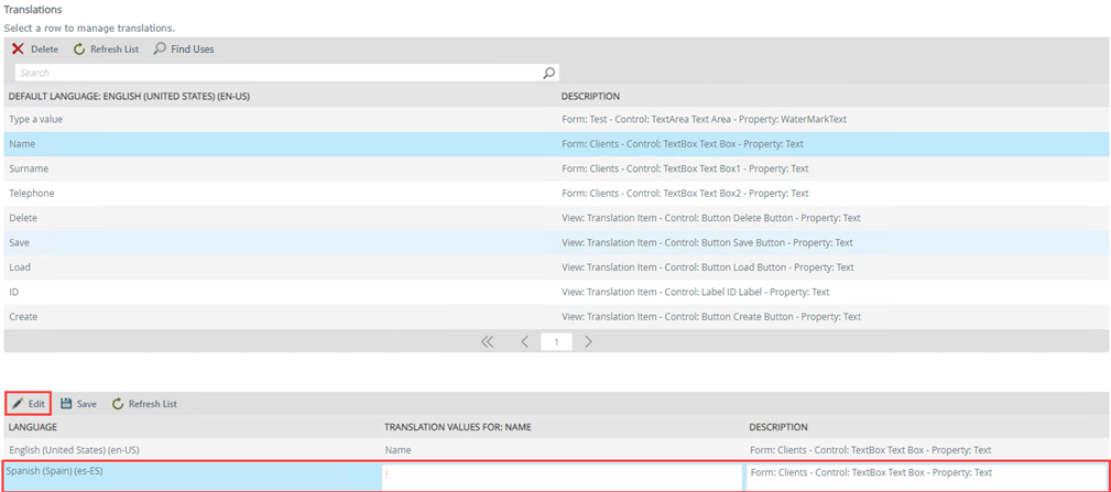 Select Spanish and click Edit as shown below. You want to add a custom translation for the Name key in Spanish (Spain) (en-ES).