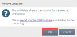 - Click OK on the pop-up message. Note that your existing translations for this language are removed when you click OK. If you remove a Selected Language which is set as the Default Language, the system uses English (United States) (en-US) as the default language.