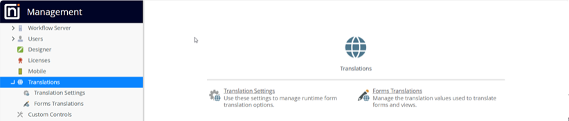 The translation settings for Workspace and Management, Runtime Forms, and Designer can only be set and managed by a user with Admin rights in Management.