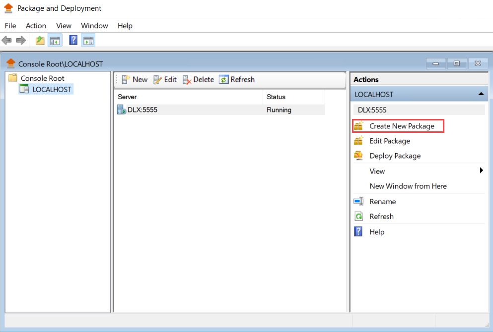 Select the server in the Console Root list, then select Create New Package from the Actions pane on the right.