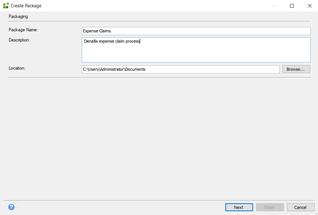 On the Create Package dialog, specify a name for the package in the Package Name text box. Enter a description of the package and click the Browse button to choose the location to save it.