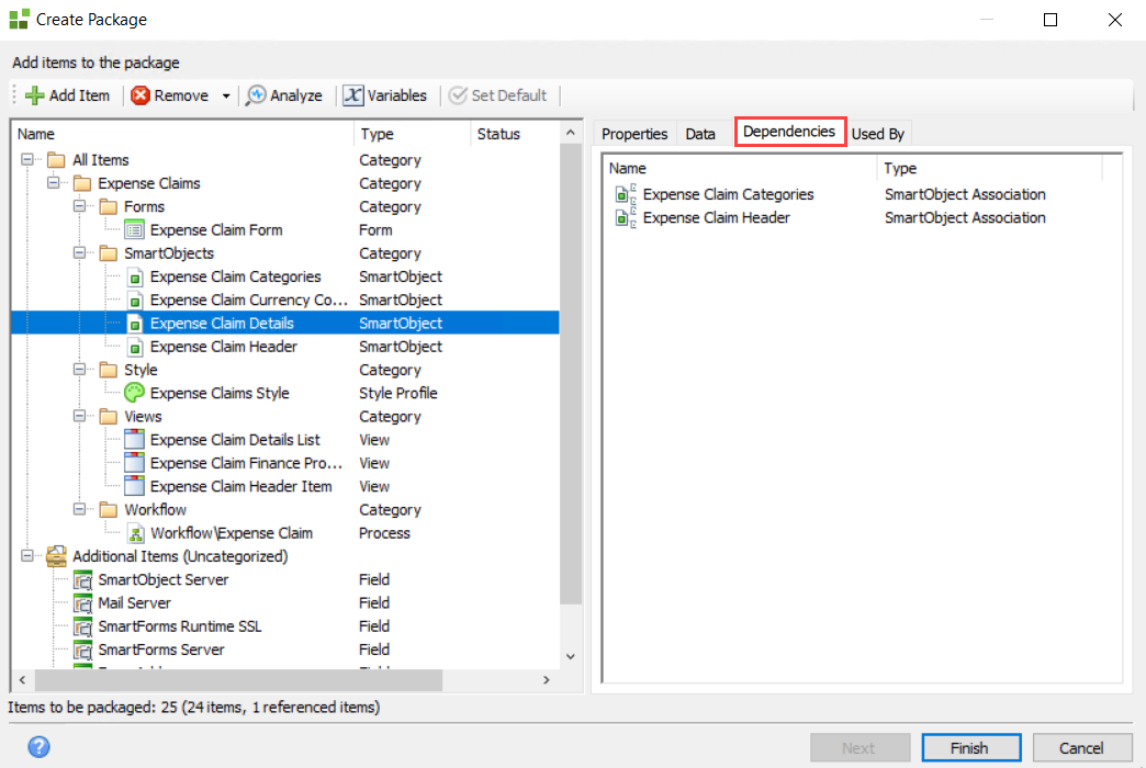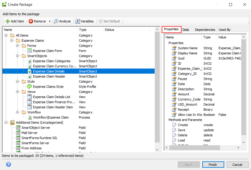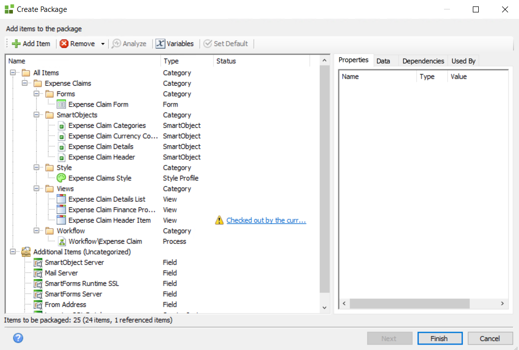 Once you have selected the artifacts, click OK to add them to the package list. The Create Package page shows your selected artifacts. The right pane lists the artifact properties, data, dependencies, and what the artifact is used by. The number of items in the package shows in the bottom left corner. In the image below, the Properties tab is selected, allowing you to view the properties of the selected artifact. The top menu provides options for adding, removing, analyzing, creating or modifying variables for a package, and setting a form as the default.