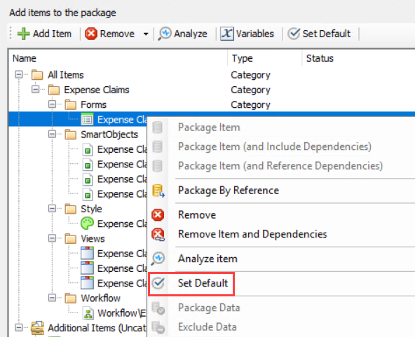- If you want a form to be opened immediately after the package is deployed, right click the form and select Set Default. Only one form can be configured as the default. (This option is often used if you need the deploying user to do additional configuration to allow the application to work, or if you want to show a form with additional information to the deploying user once the package is deployed).