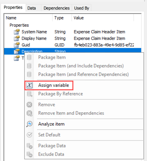 - Right-click the relevant property and select Assign variable. (If the Assign variable option does not appear, the field is not a property for which you can assign a variable.)