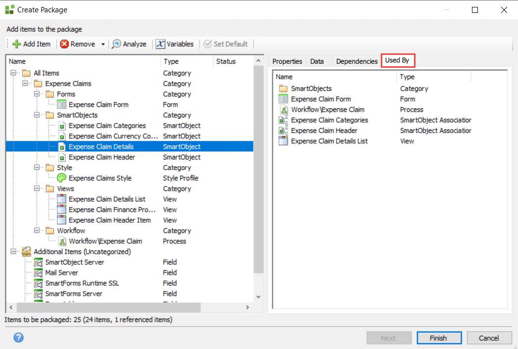 In the image below, for example, the Expense Claim Details SmartObject is used by many other items.