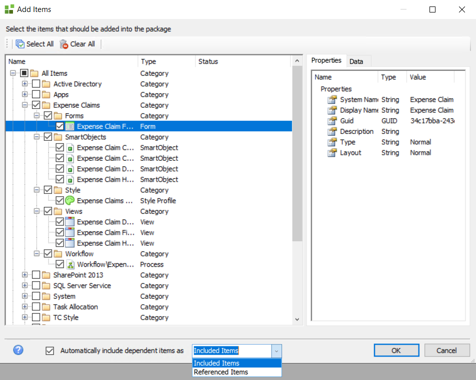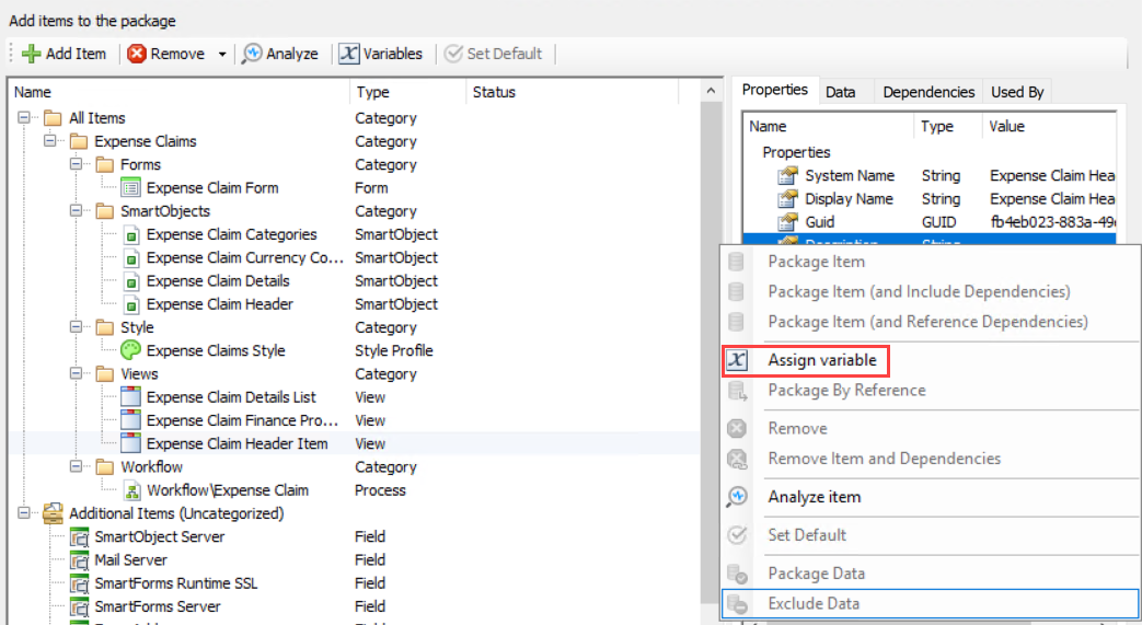 - Select the artifacts (SmartObjects, views, forms, workflows, style profiles, and reports) to include in the package. The Type column shows what the artifact is, and if you select an artifact you can see its properties in the Properties and Data pane on the right.