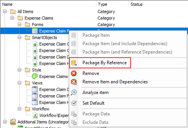 For example, if multiple workflows use an Employee SmartObject, the first package you create and deploy to a target environment contains the full Employee SmartObject artifact. Subsequent packages you create for other workflows that also use the Employee SmartObject should include the SmartObject by reference. The package will not contain the SmartObject definition, but when the package is deployed it will use the reference to create the required links and dependencies to the existing Employee SmartObject on the target environment.