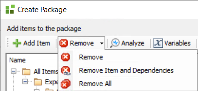 . - The Remove option provides three options; Remove, Remove Item and Dependencies, and Remove All. Select artifacts in the package before using these options.