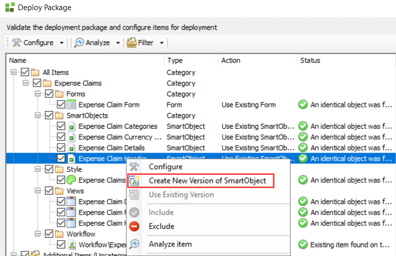 When deploying a package that includes SmartObject data, you have the option to create a new version of the SmartObject on the target environment if the SmartObject already exists, or to keep the target data.