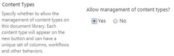 In this example, in the SharePoint source environment, you enable the option to allow management of content types.