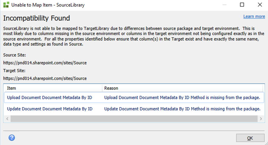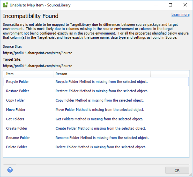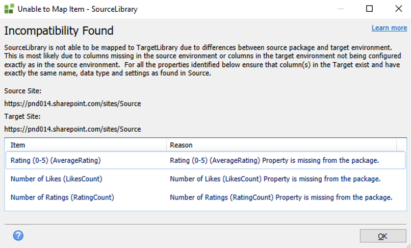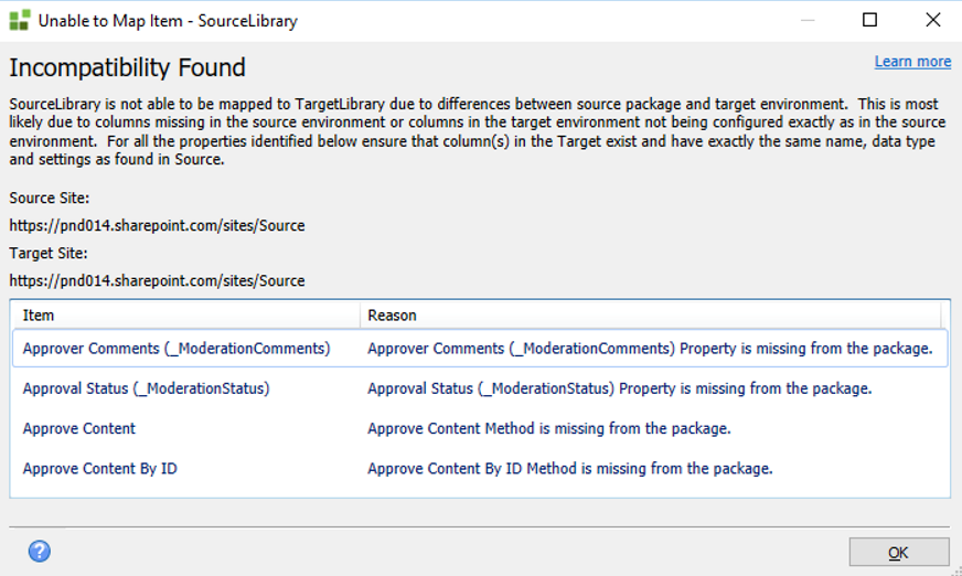 When you deploy a package between environments, some SharePoint based artifacts mismatches (between the source and target environments) might occur. These properties show up during list validation when a site or list features are enabled/disabled between source and target environments. In these cases, a red notification prompts you of a mismatch. Click the More Link for additional information.