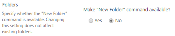 In this example, in the SharePoint source environment, you select the No option to not make the New Folder command available.