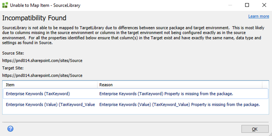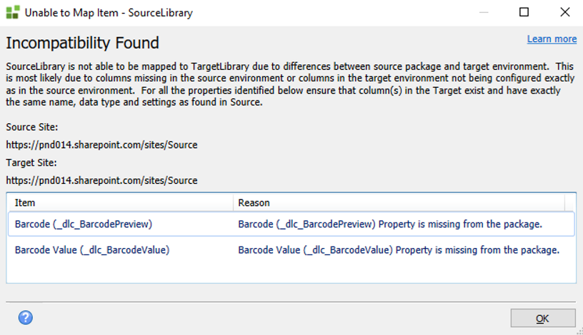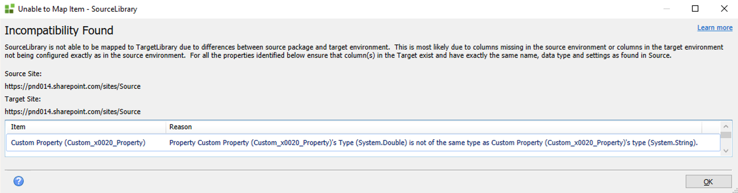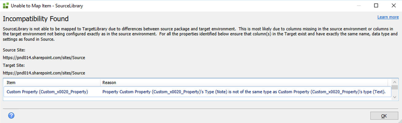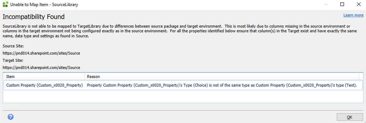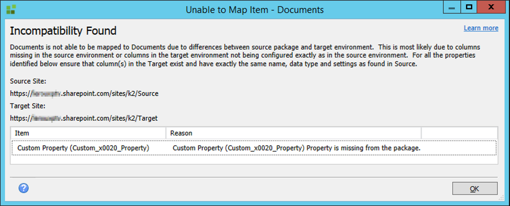 In this example, your source package contains a property called Custom Property, but this property does not exist in the target List/Library.