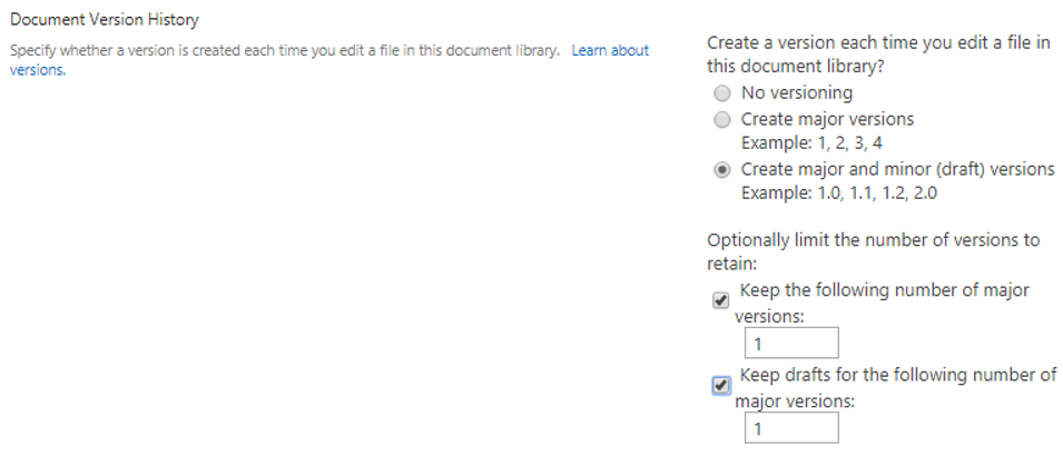 In this example, in the source environment, you select the Create major and minor (draft) versions radio button within the Document Version History section in SharePoint.