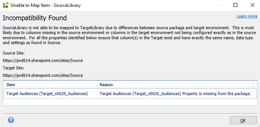The following incompatibility shows: Target Audiences (Target_x0020_Audiences) Property is missing from the package.