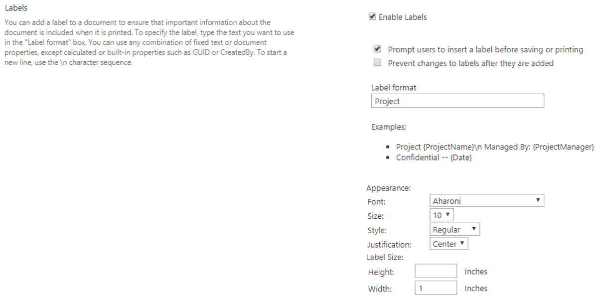 In this example, in the SharePoint source environment, you select enable the labels option to assign a label to a document to ensure that information about the document is included when its printed.