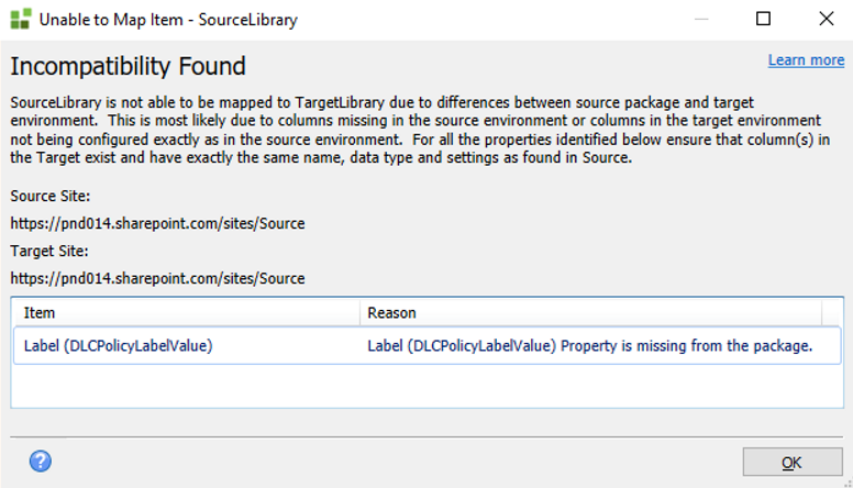 The following incompatibility shows: Label (DLCPolicyLabelValue) Property is missing from the package.