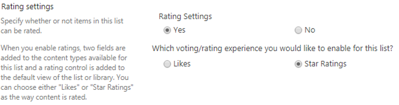 In this example, in the SharePoint source environment, you select to enable the rating option to specify whether or not items in the list can be rated.