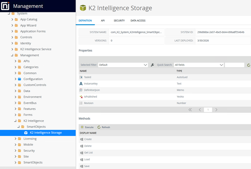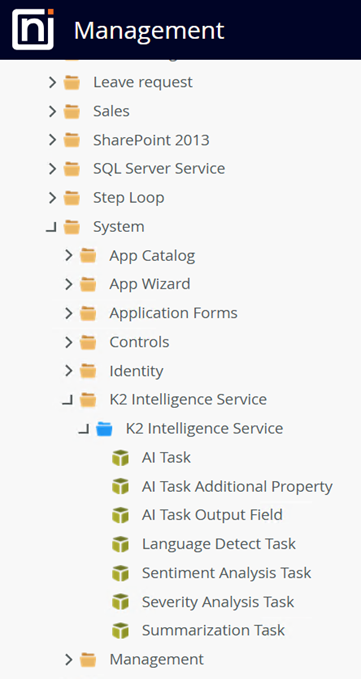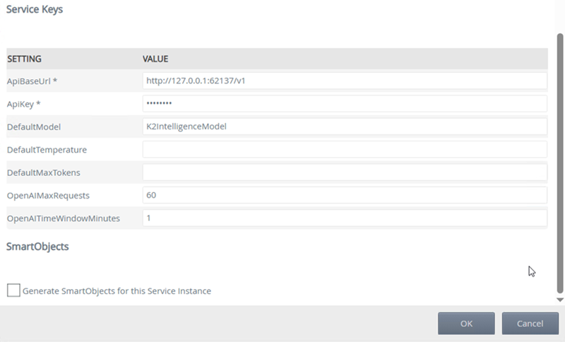 The K2 Intelligence service type exposes the K2 Intelligence service instance and then create SmartObjects that utilize the service objects exposed by the service instance. It lets you create and run AI-powered tasks within your K2 environment by defining the task and its expected response. You can create more service instances which will include the AI tasks. The K2 Intelligence Service runs llama-server (from llama.cpp) as a managed Windows service. See the K2 Intelligence Service Windows service for more information, and best practices for creating and managing AI tasks.