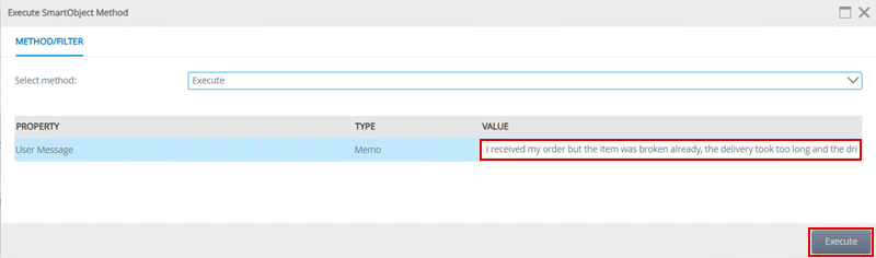 - In the User Message property, type the message you want to analyze under Value, and click Execute.