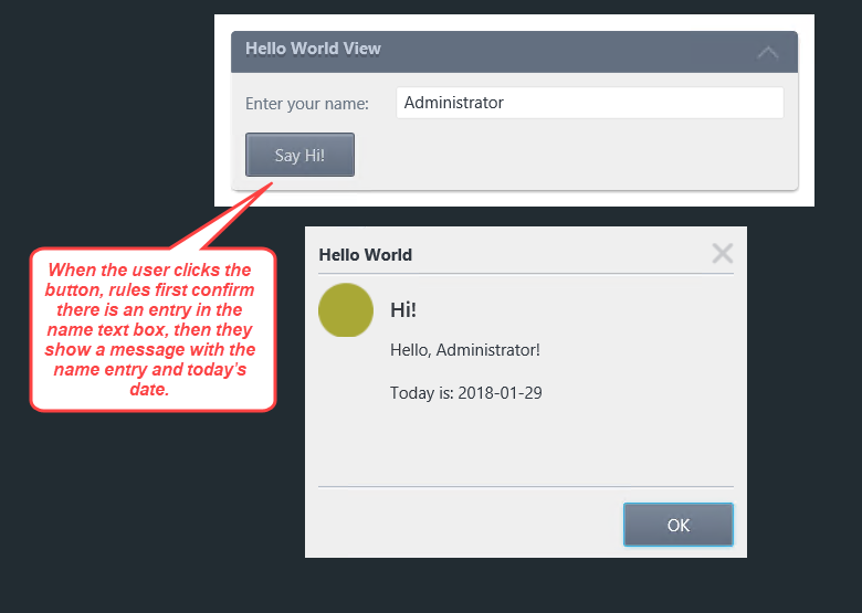 In this tutorial, you will build a simple web page that contains a label, text box and button. You will enter a name into the text box, then click the submit button. After you click the submit button, a conditional check will confirm that you entered a name, then an action will show you a message. The message contains the name you entered, along with the current date.