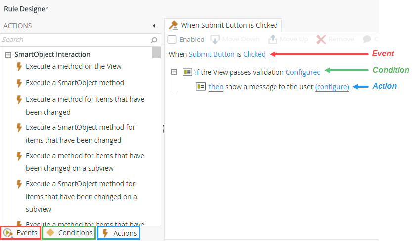 Most user interfaces require some kind of programming or processing. For example, saving updates made to a record into a database when the user clicks the “Save” button, or starting a Workflow when the user “submits” a Form. SmartForms use Rules to perform these “programming” actions. (We use “programming” in quotes because there is actually no coding required when implementing the processing tasks. Instead, the Form designer will use graphical, wizard-based configuration tools to assemble the programming logic.)