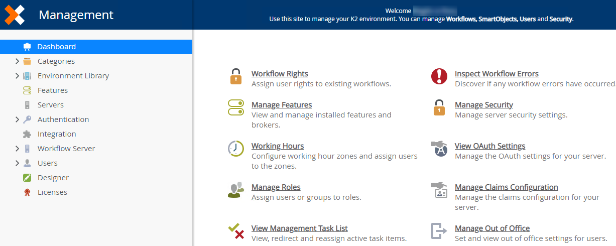 - Launch the Management site.If you are unsure of how to launch the Management site, see Accessing Nintex K2 Sites.
