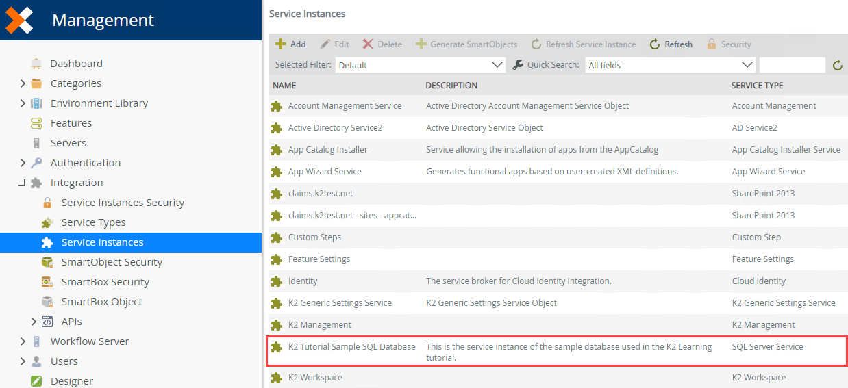 - Next, you will create a new instance of the SQL Server Service type. To summarize this process, you are creating a connection to a specific data source (SQL Database) so that you can retrieve the properties and methods (Leave Types) from that data source to use in your application (Leave Type drop-down list). Nintex K2 has a large number of out-of-the-box service types that you can use to connect to other data sources and you can create your own as well.