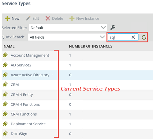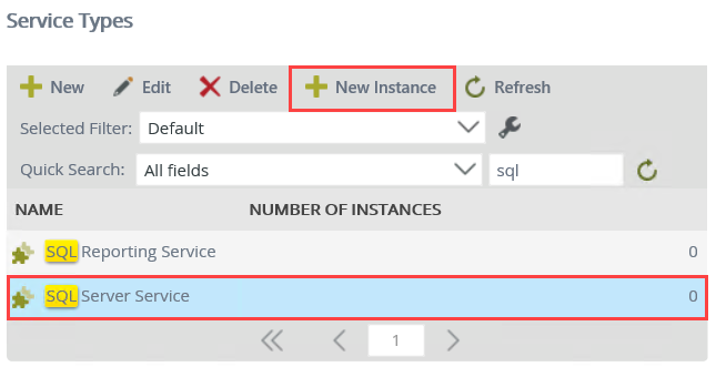 - Service types with "SQL" in the name are returned. (Depending on your environment, you may see additional service types.) Select SQL Server Service, then click the New Instance button. In this step, you are creating a new instance of the SQL Server Service type.