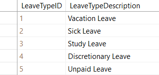 Table Name Table LeaveTypes Column Name Data Type Column Setting Columns LeaveTypeID int (Autonumber) Primary key LeaveTypeDescription nvarchar(50) - Create the following entries in the database. If you used the SQL script, these entries already exist but you still have to assign rights to your K2 Service Account.