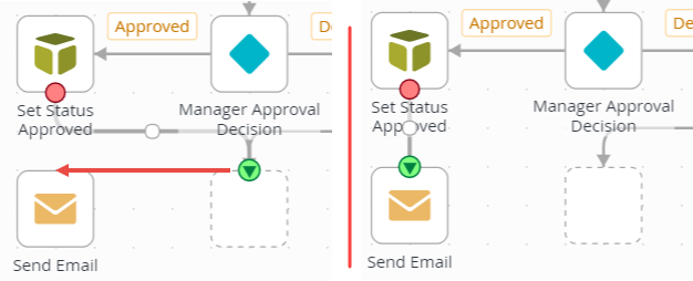 - Click the Set Status Approved outcome line to expose its handles. Drag the handle from the empty step (green triangle) to the Send Email step. Repeat this to connect the Set Status Denied step to its corresponding Send Email step.