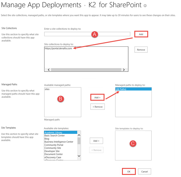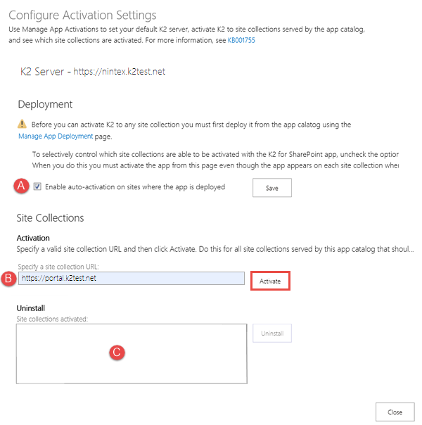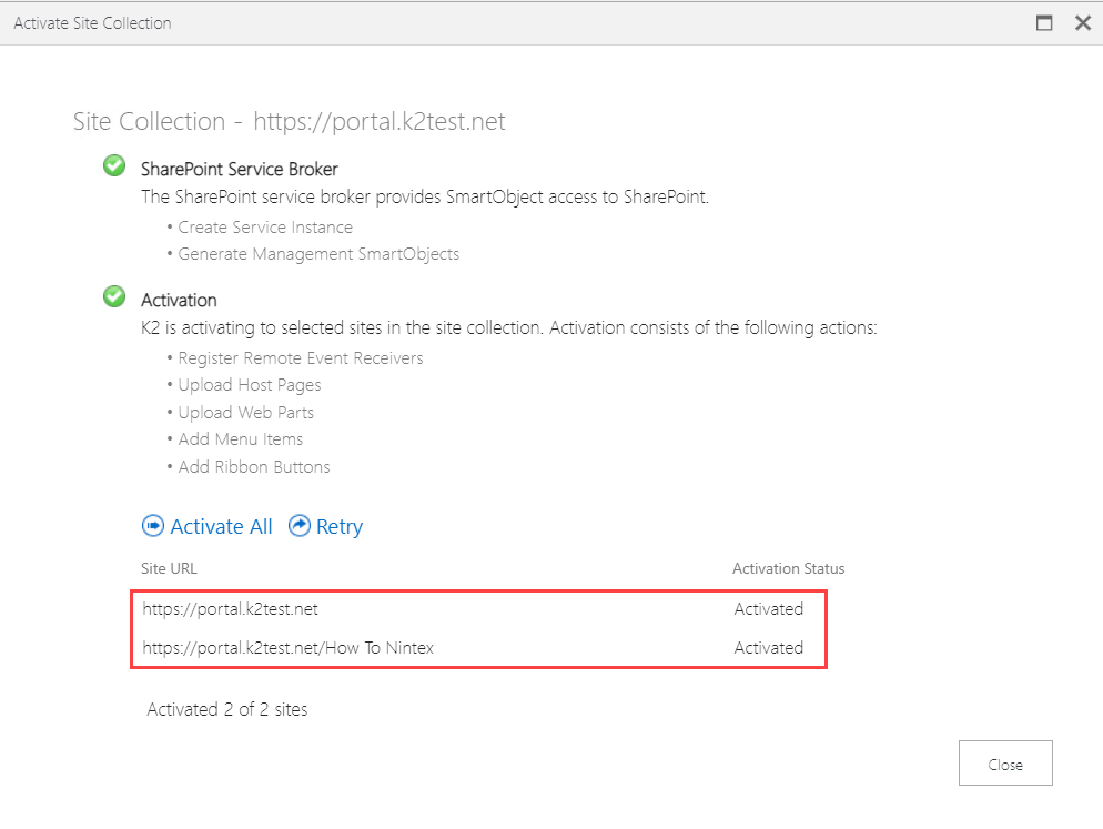 In this step, you confirmed the activation of the K2 for SharePoint app. You have registered, deployed and activated the app to your SharePoint site collection. We recommend deploying the app to the root site collection level with the All Paths option. Any site collections or subsites added will have the app available with out further intervention. You can also enable the auto-activation option, which enables the app to any new site collections or subsites. After confirming the app deployment and activation with your test list, you see the K2 menu.