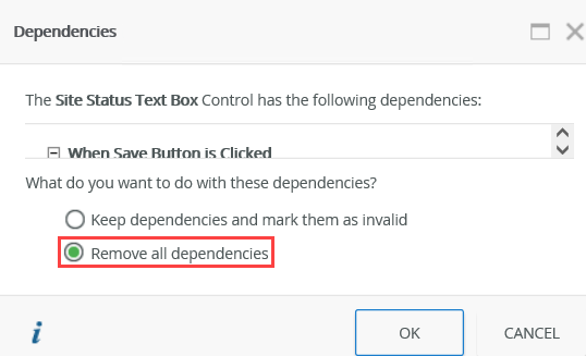 - You see a warning indicating the control has dependencies. Select the Remove all dependencies option, then click OK.