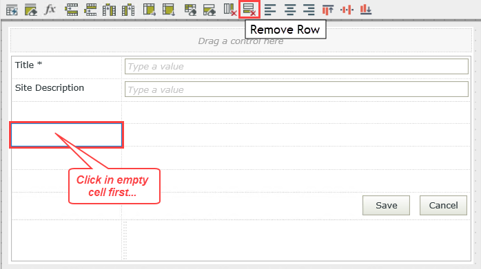 Be careful not to delete a row with a control. For example, the row that contains the Save and Cancel buttons.