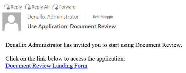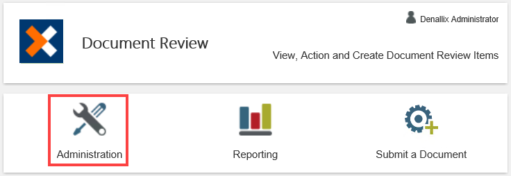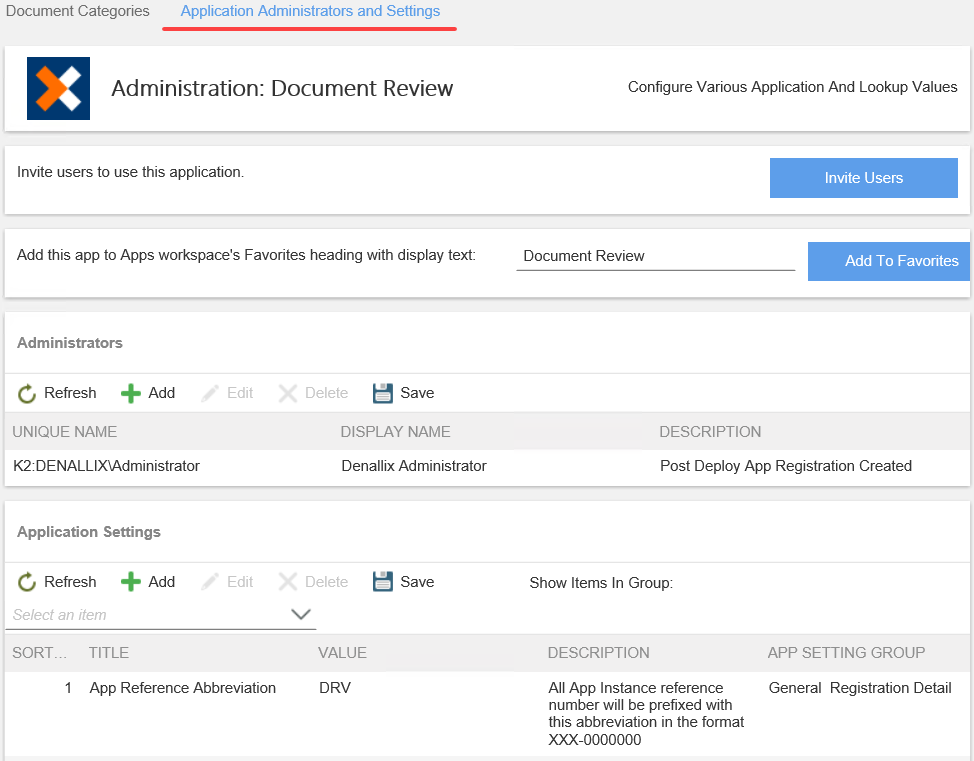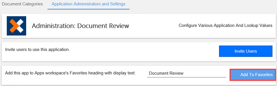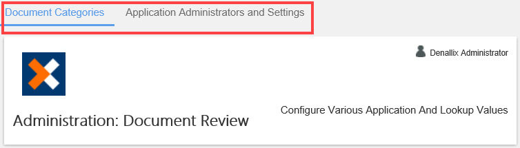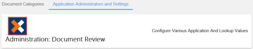 - On the Menu bar, select the Application Administrators and Settings tab. In this example, the Document Review app is selected.