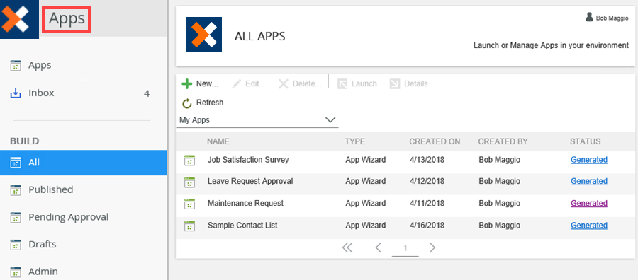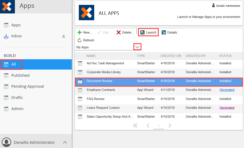 - Open an app by launching it from either the All option in the Build section or My Apps list. This list shows apps you create, apps created by other users to which you have access, and apps installed from the App Catalog. From this list, you can open apps to administer. Select the app and click Launch to access the Administration feature for the app.