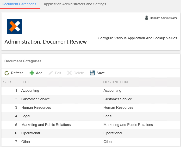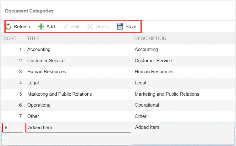 - The Document Categories section contains a list of categories. At runtime this shows as a drop-down menu on the request form but you can customize this according to your needs. Click Add to add a new category. To edit an existing category, click Edit. To delete and item from the list, click Delete. To save changes made to the list, click Save. Click Refresh to refresh the items in the list.