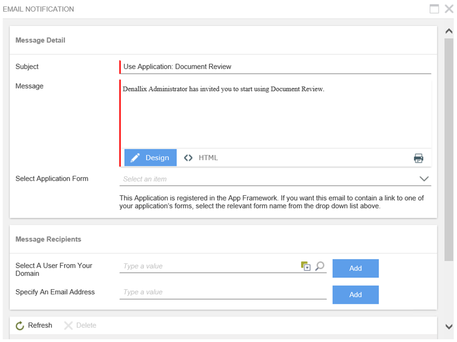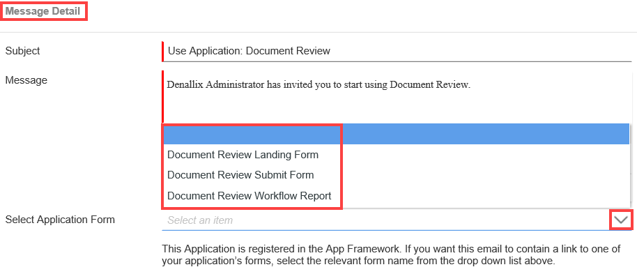 - Edit the email subject line and message body. Select the request form link you want to appear in the email message from the Select Application Form menu.